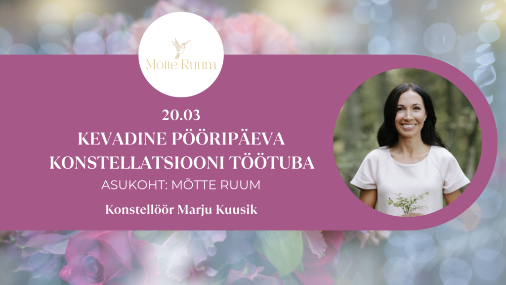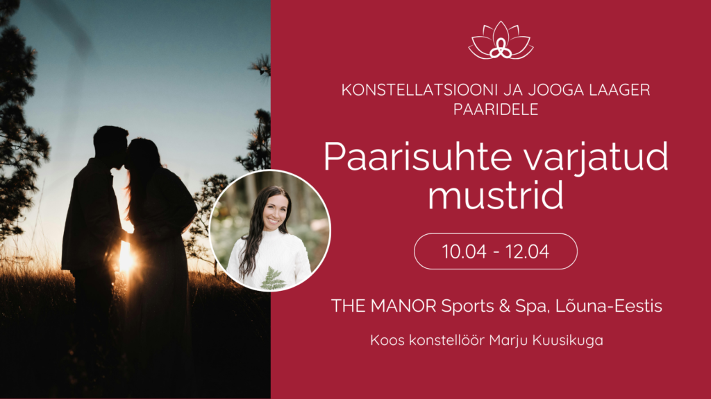 Sündmused Sündmused Konstellatsiooni ja jooga laager paaridele "Paarisuhte varjatud mustrid" Kuupäev: 10.-12.04.26 Asukoht: The Manor Sports & Spa, Lõuna-Eestis Osalus: 995 eur paarile Fb üritus Loe rohkem Pööripäeva konstellatsiooni töötuba Kuupäev: 20.03.26 Kell: 17.00-22.00 Asukoht: Mõtte Ruum (Luha 20) Osalus: 15 / 170 / 200 eur Fb üritus Loe rohkem